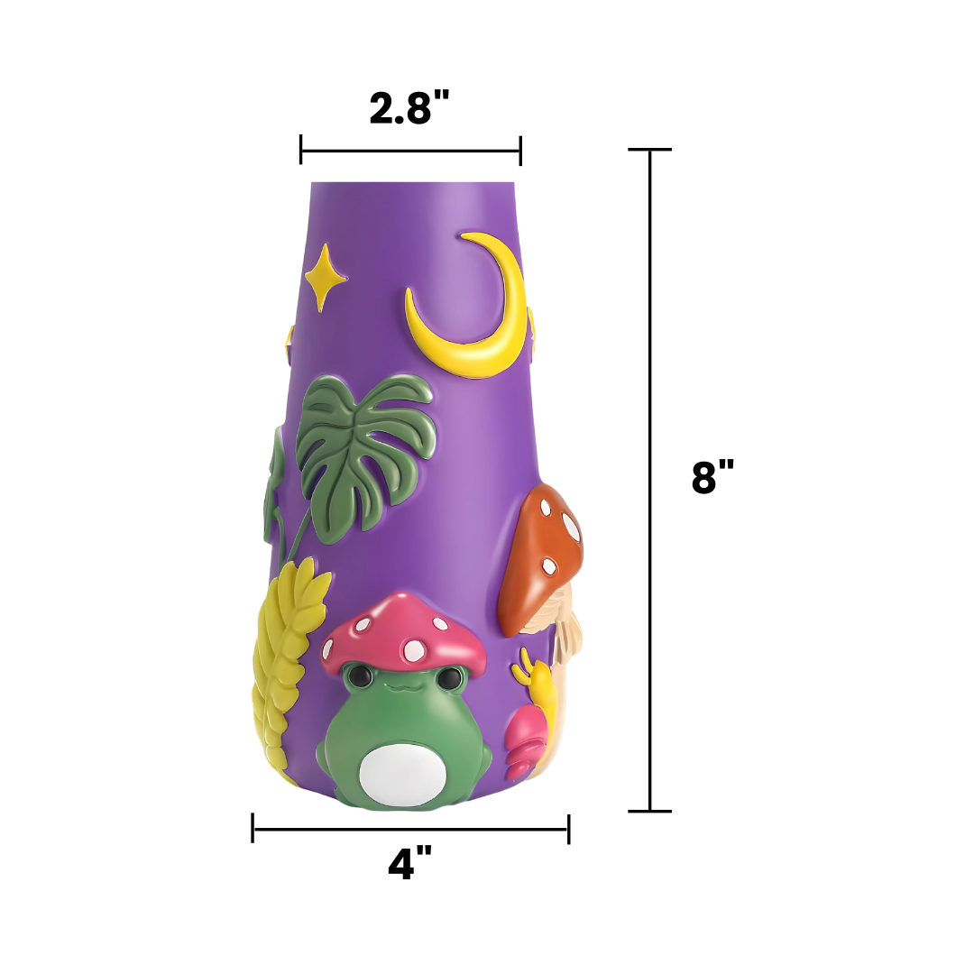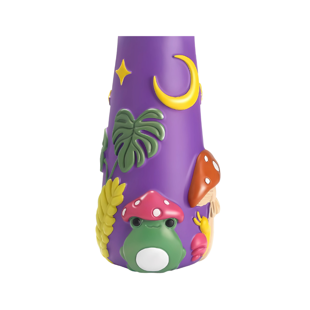 A whimsical, matte-finished purple vase decorated with nature-inspired, cartoon-style embellishments. Featuring a frog wearing a red mushroom cap, surrounded by leafy greens, yellow wheat, twinkling stars, and a crescent moon, this vase tells a playful story. The snail detail adds movement and personality, while the vivid purple statice flowers crown the piece with natural charm. A delightful blend of fantasy and flora.