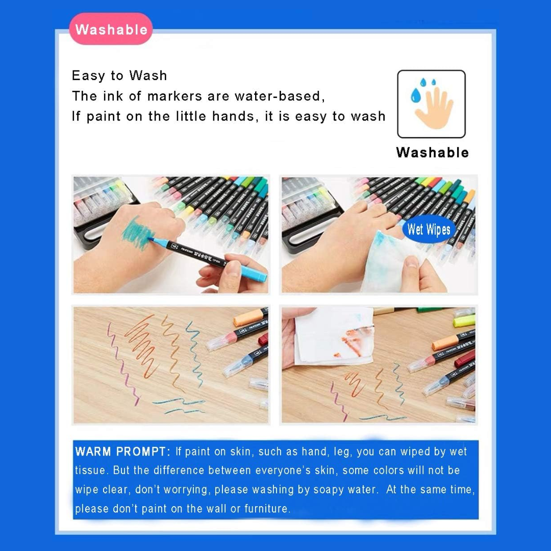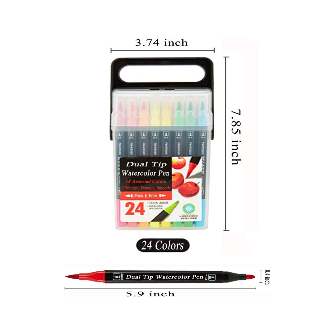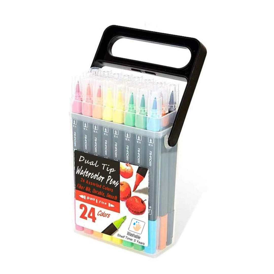Explore endless creativity with this 24-piece dual-tip watercolor pen set. Each pen features a flexible brush tip for painting effects and a fine tip for detail work. The washable, smooth-flowing ink blends beautifully for lettering, coloring, and illustration. Packaged in a portable handled case for easy storage and travel—perfect for artists of all levels.